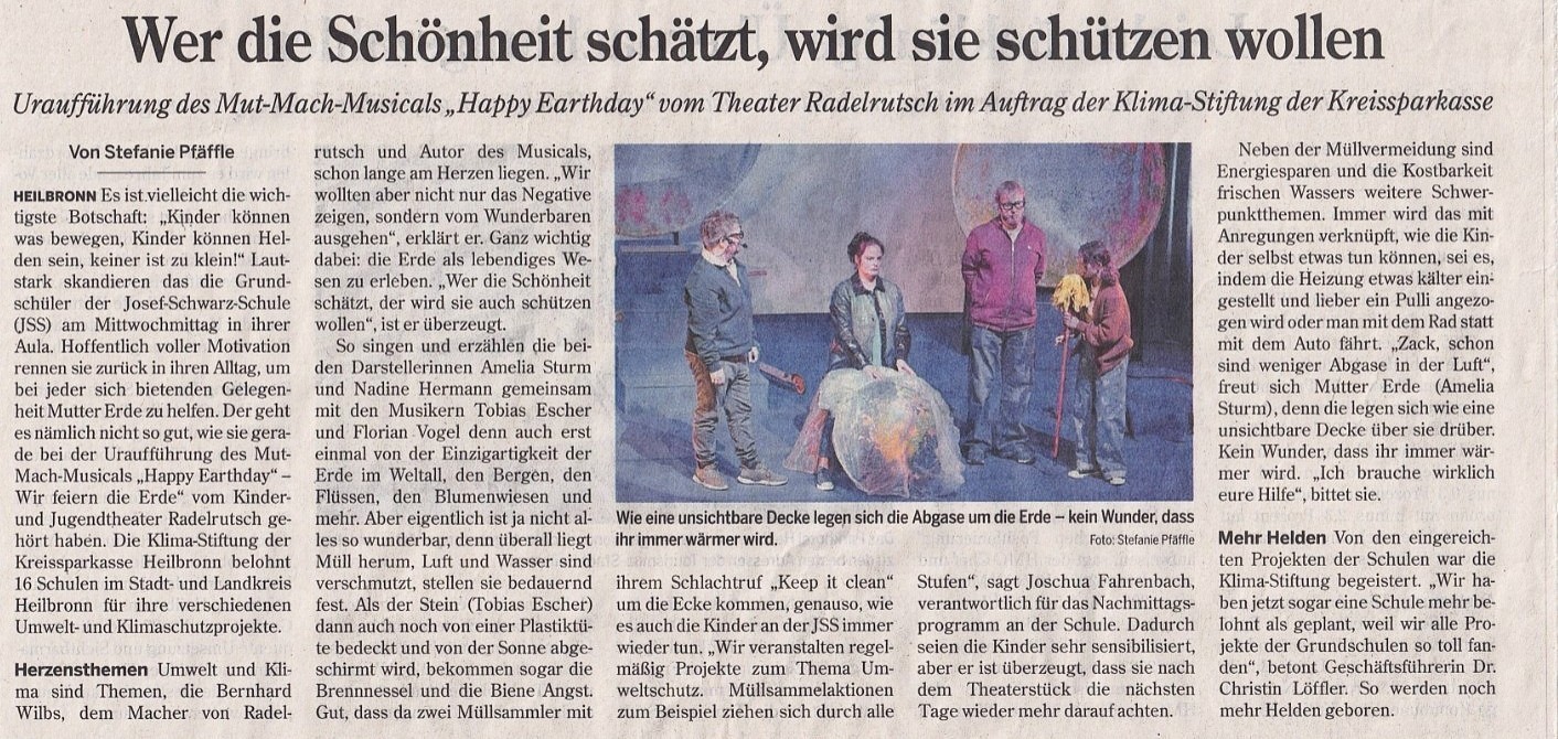 Wir freuen uns über unser gemeinsames Projekt in Kooperation mit der Klimastiftung der Kreissparkasse Heilbronn. Alle Grundschulen im Stadt -und Landkreis Heilbronn haben die Möglichkeit sich für das UmweltTheaterMusical "Happy Earthday" zu bewerben.