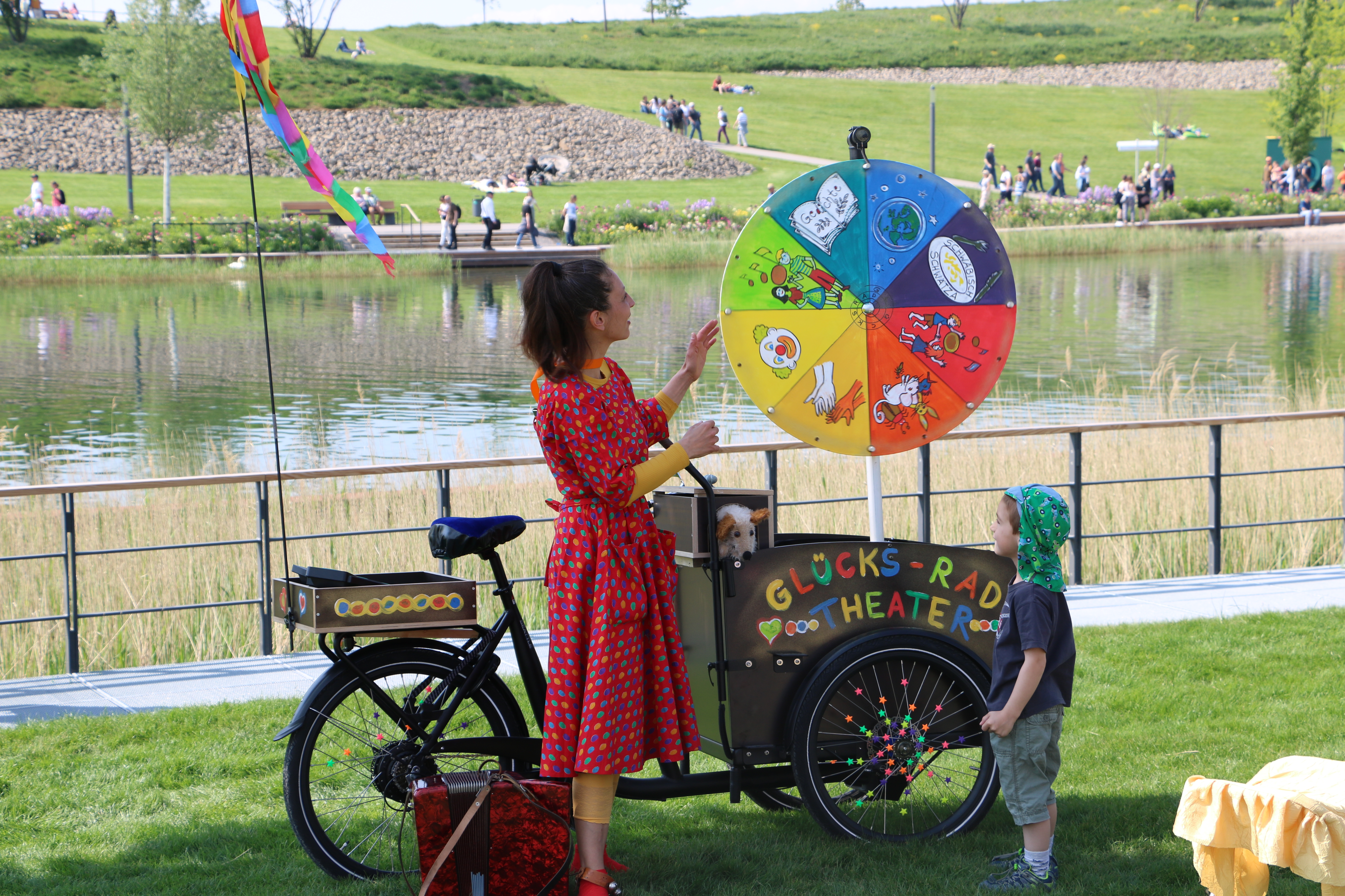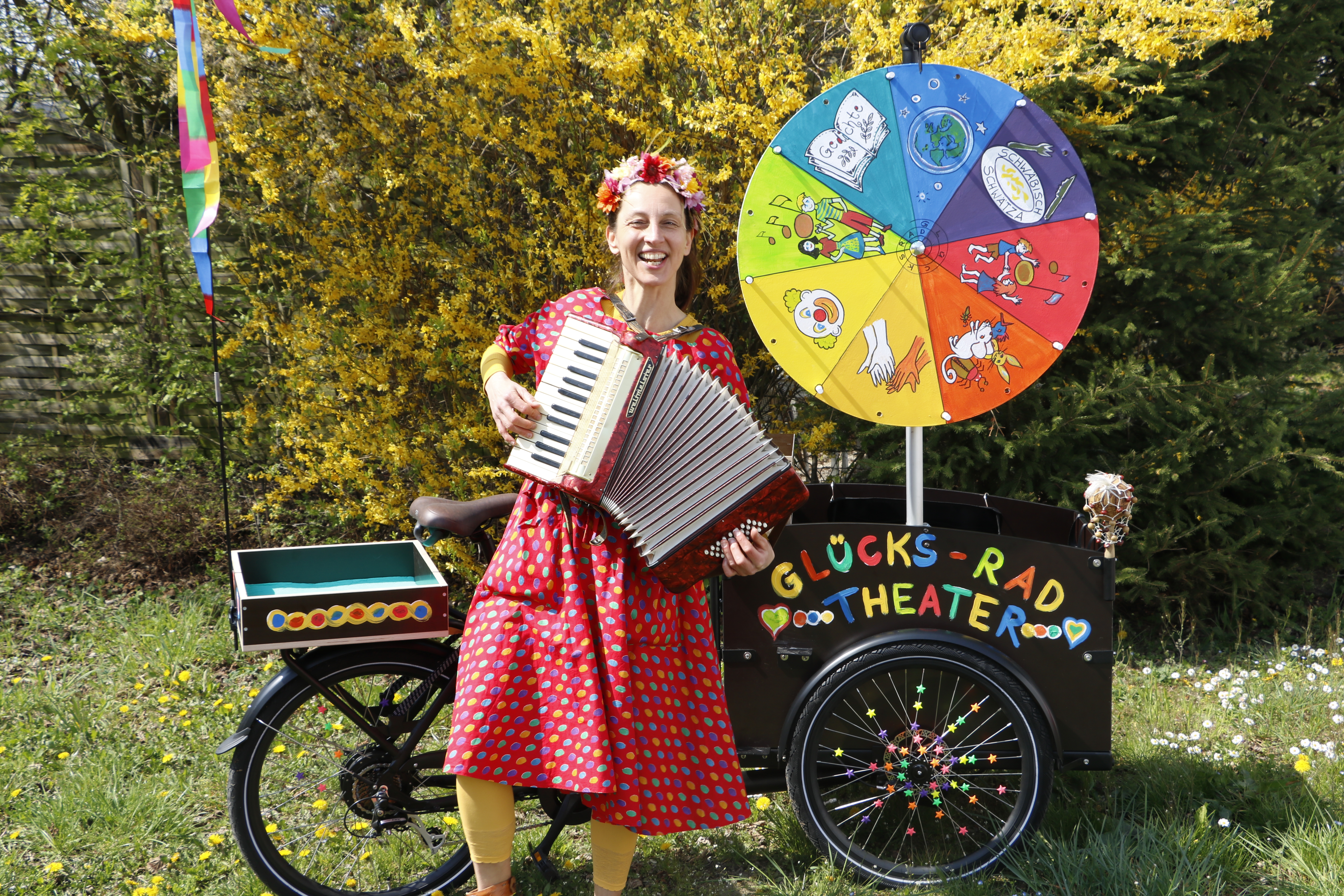 Ein DRIVING-ACT. Die Künstlerin spielt und erzählt an wechselnden Orten Theatergeschichten und Gedichte für Menschen jeden Alters, die zwischendurch Kultur genießen möchten. Das Glücks-Fahrrad fungiert als mobile Bühne und, wer möchte, kann am Glücksrad drehen und gewinnt eine feienes THEATER-BONBON für sich und alle Zuschauer.